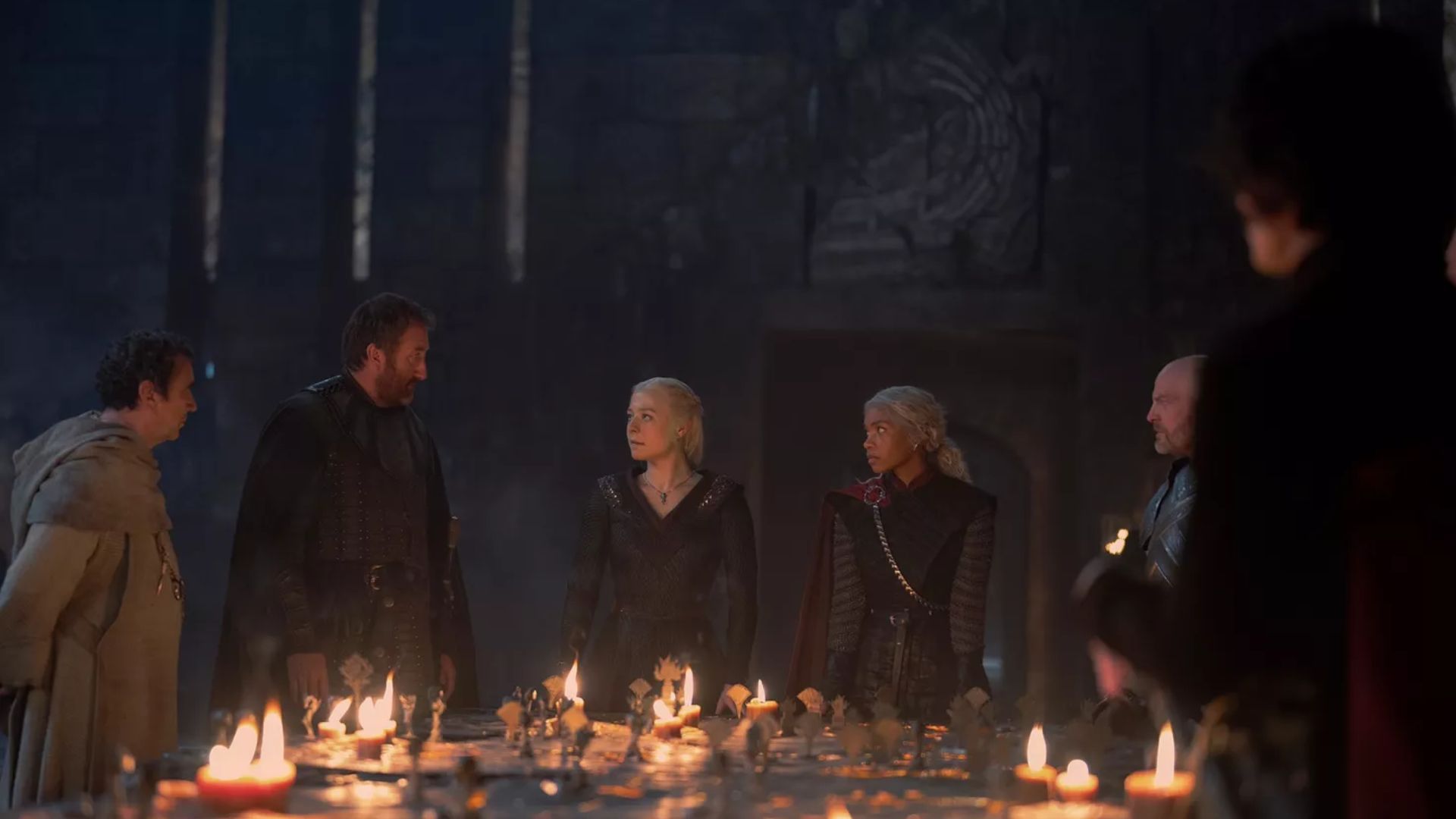 Rhaenyra has the advantage, as she has gathered six dragons on her side. Corlys tells her that his ships are ready to sail at any time, awaiting her command. Corlys suggests that she take control of King's Landing quickly and warns of Helaena's dragon, Dreamfyre.