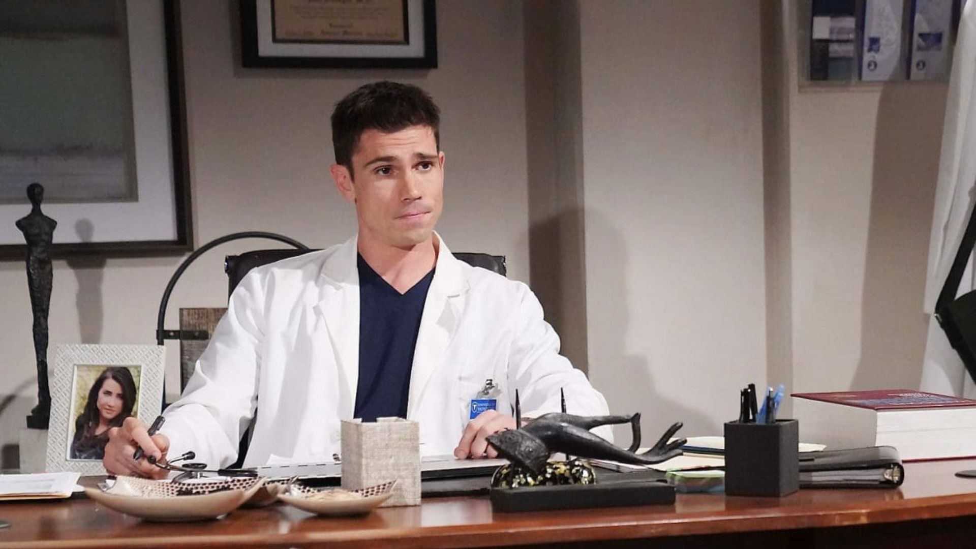 Finn’s (Tanner Novlan) office at the hospital has been busy lately. He has had a visit from his mom Li (Naomi Matsuda), who wanted to discuss their amazing rescue of Steffy (Jacqueline MacInnes Wood) and the capture of Luna (Lisa Yamada). Unfortunately, she didn’t share the secret to the Nozawa power, at least not yet.