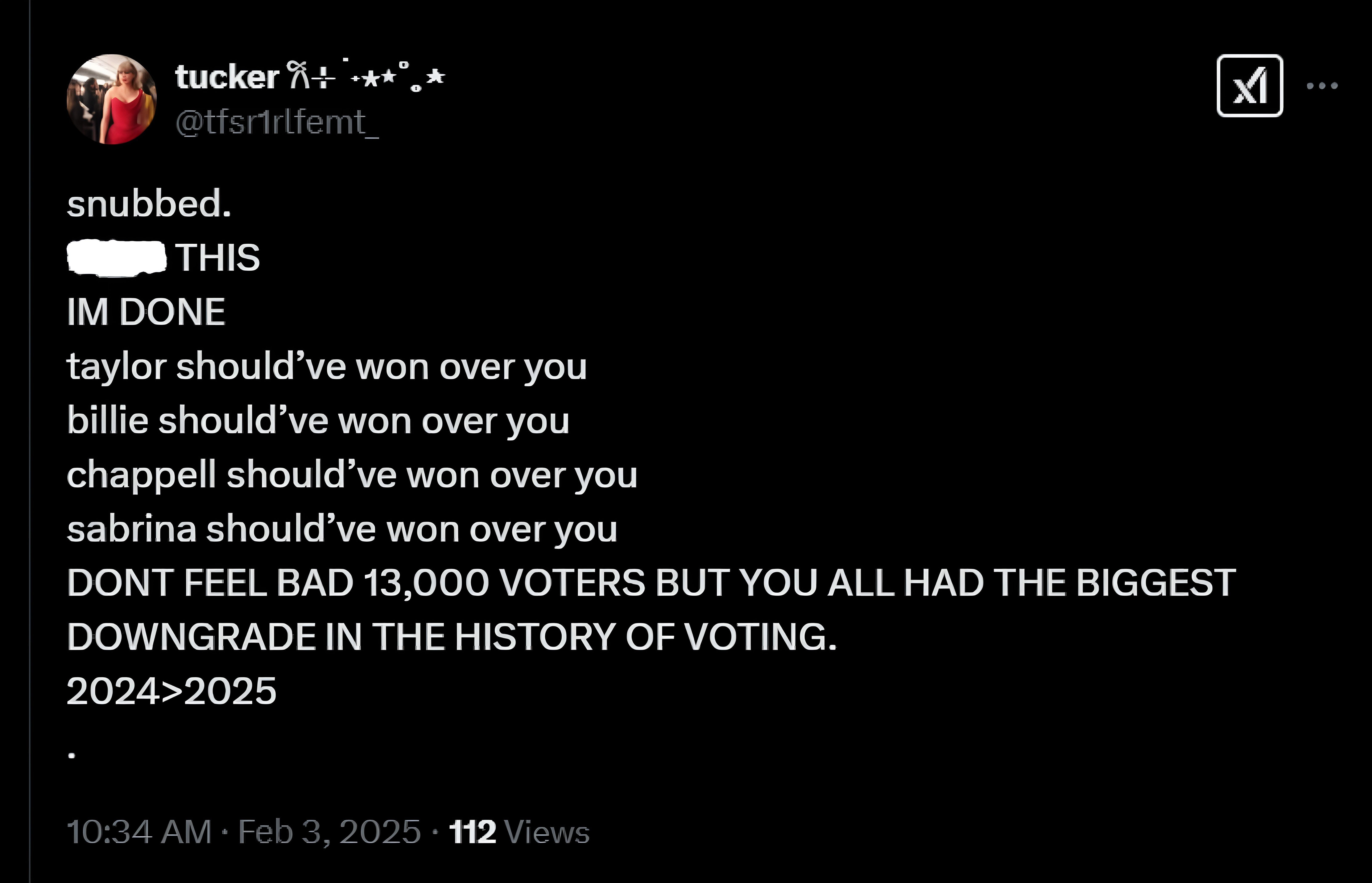 "snubbed. F*** THIS IM DONE taylor should’ve won over you billie should’ve won over you chappell should’ve won over you sabrina should’ve won over you DONT FEEL BAD 13,000 VOTERS BUT YOU ALL HAD THE BIGGEST DOWNGRADE IN THE HISTORY OF VOTING. 2024>2025."