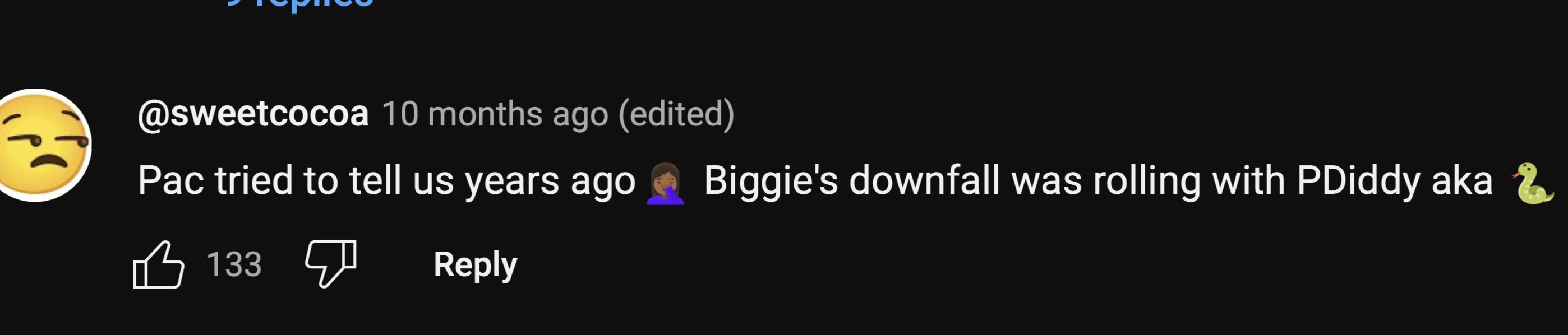 "Pac tried to tell us years ago. Biggie's downfall was rolling with PDiddy aka [snake emoji]."