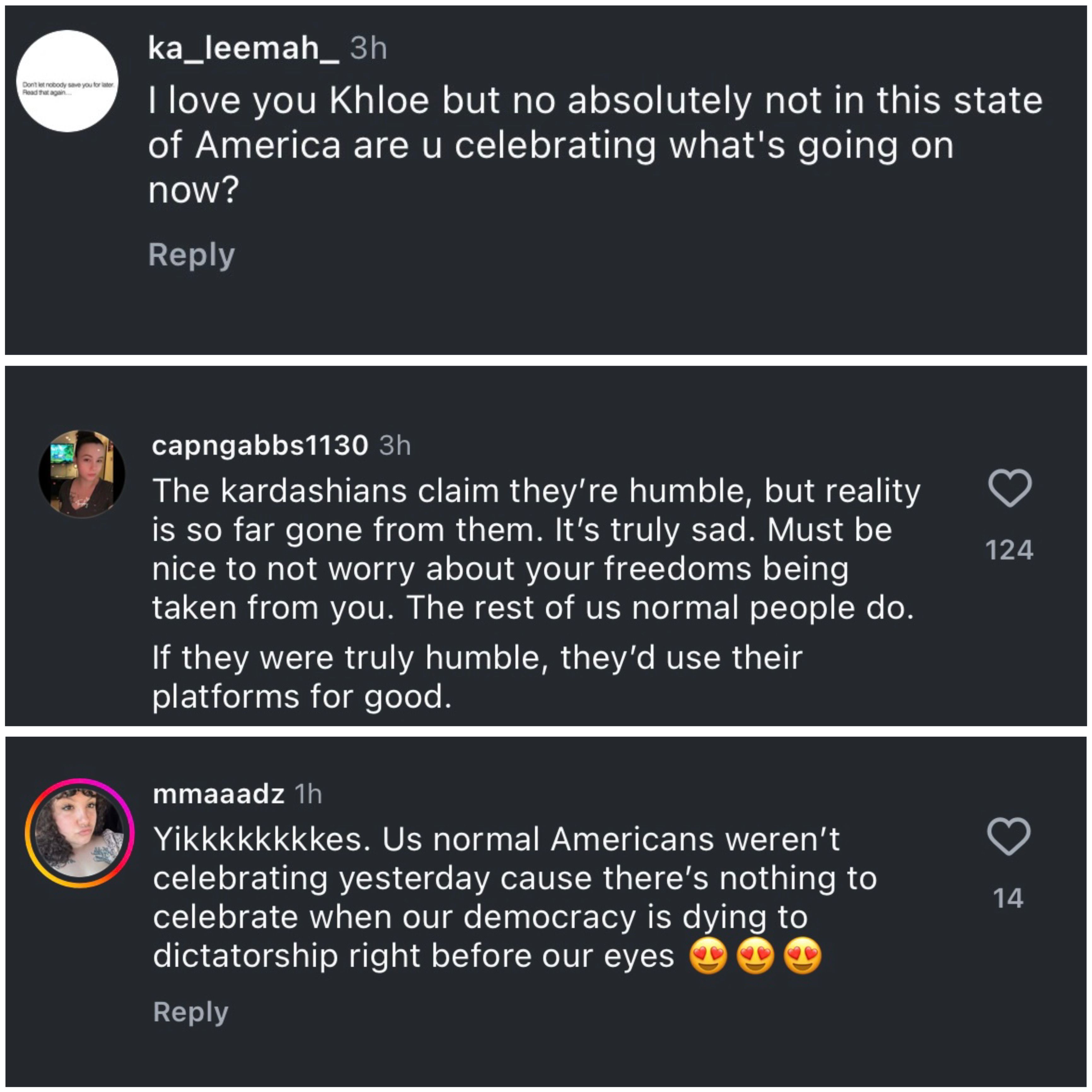 “I love you Khloe but no absolutely not in this state of America are u celebrating what's going on now?,” @ka_leemah_ commented.