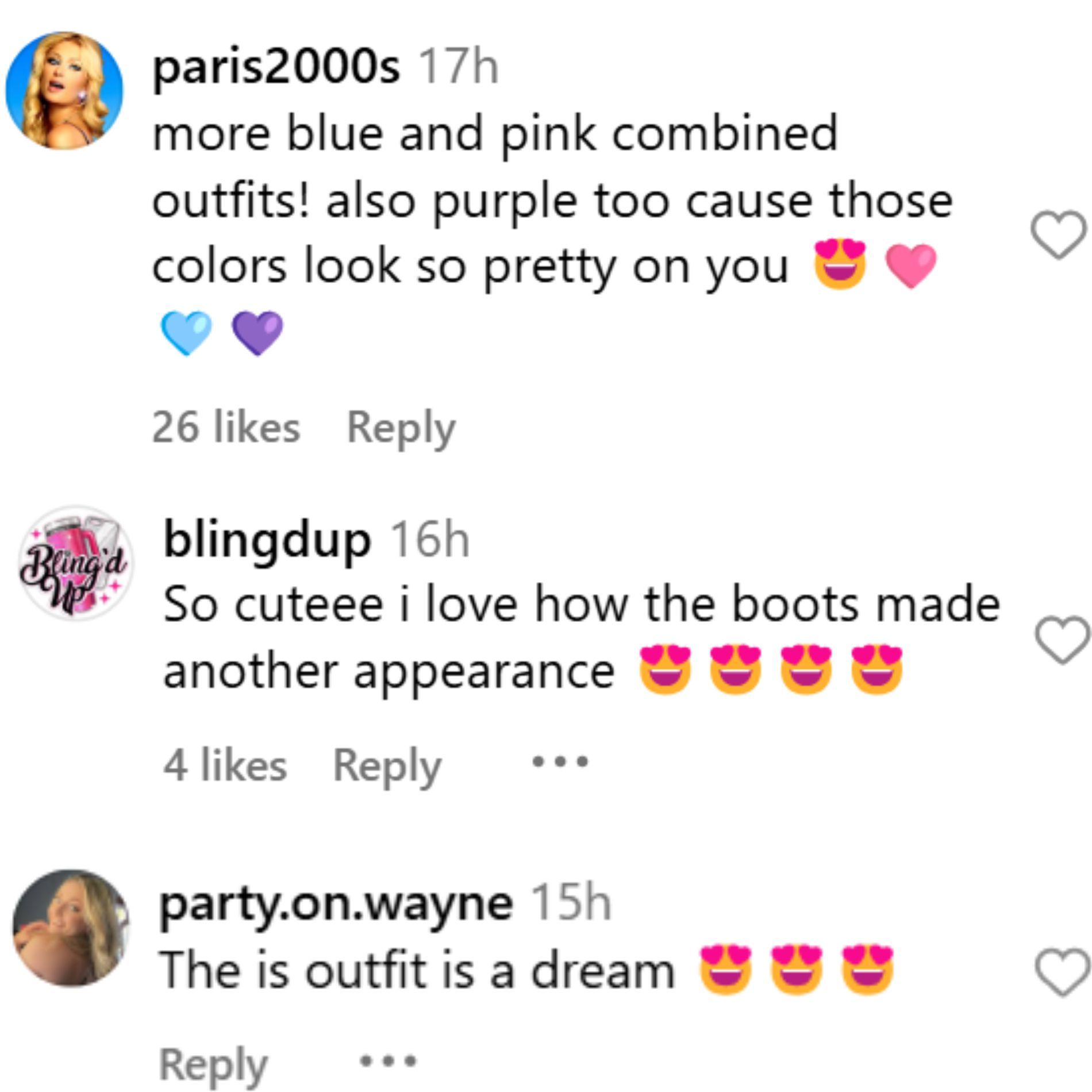 "more blue and pink combined outfits! also purple too cause those colors look so pretty on you 😍🩷🩵💜," a Paris fan, @paris2000s, added.