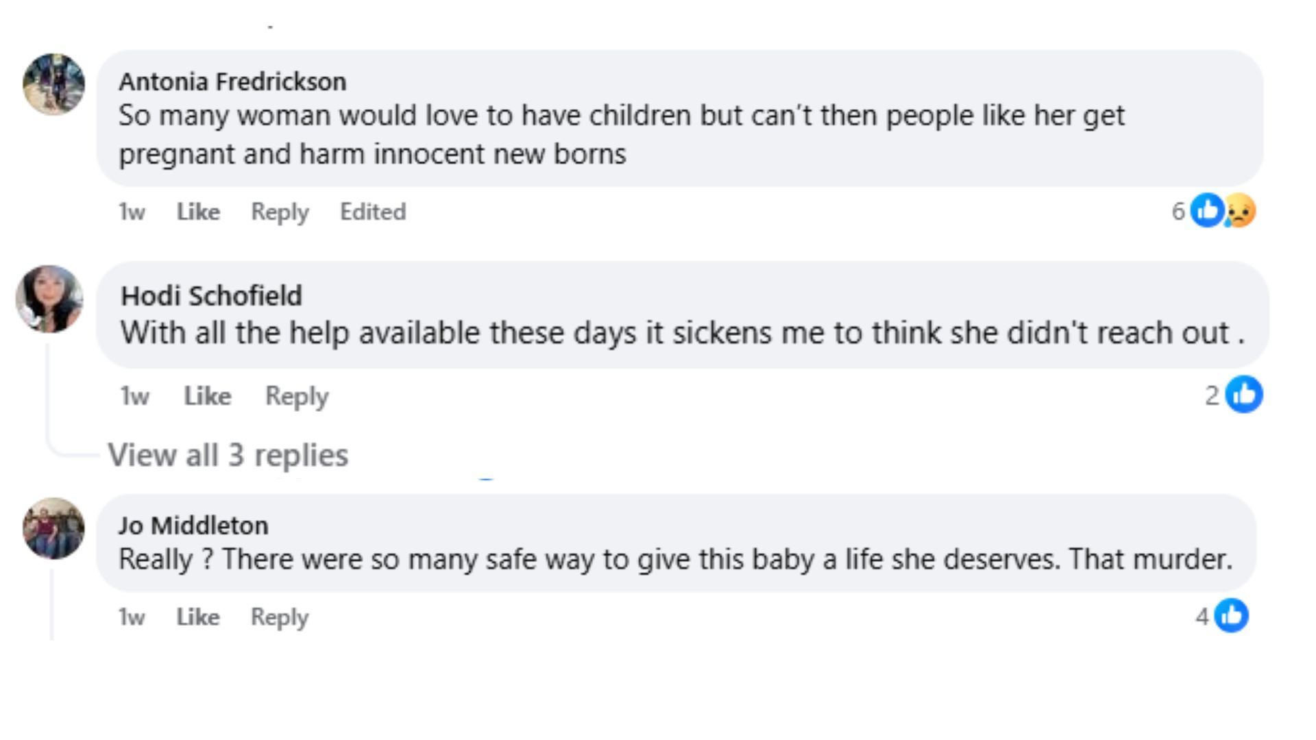 "So many woman would love to have children but can’t then people like her get pregnant and harm innocent new borns."