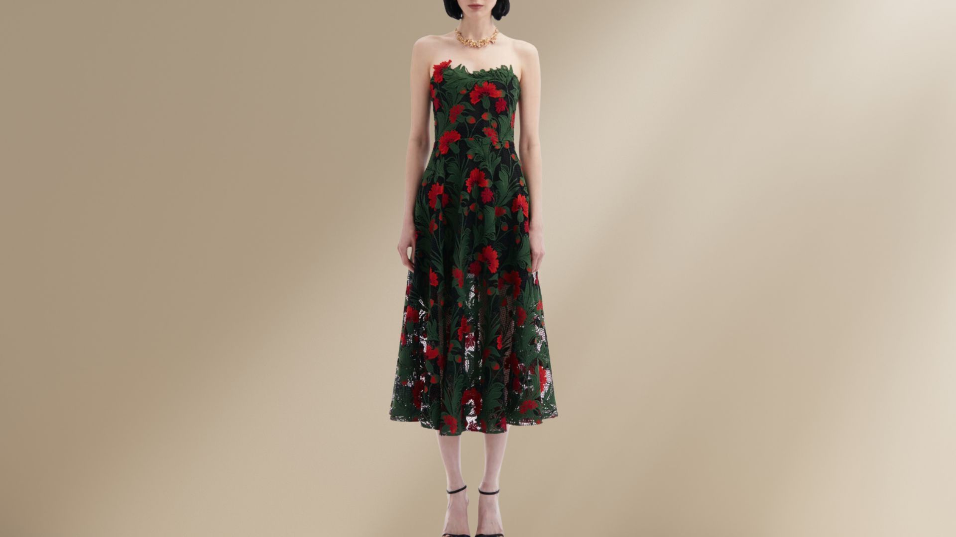 10) Oscar de la Renta Strapless Multicolor Marbled Carnation Guipure Lace Midi Dress