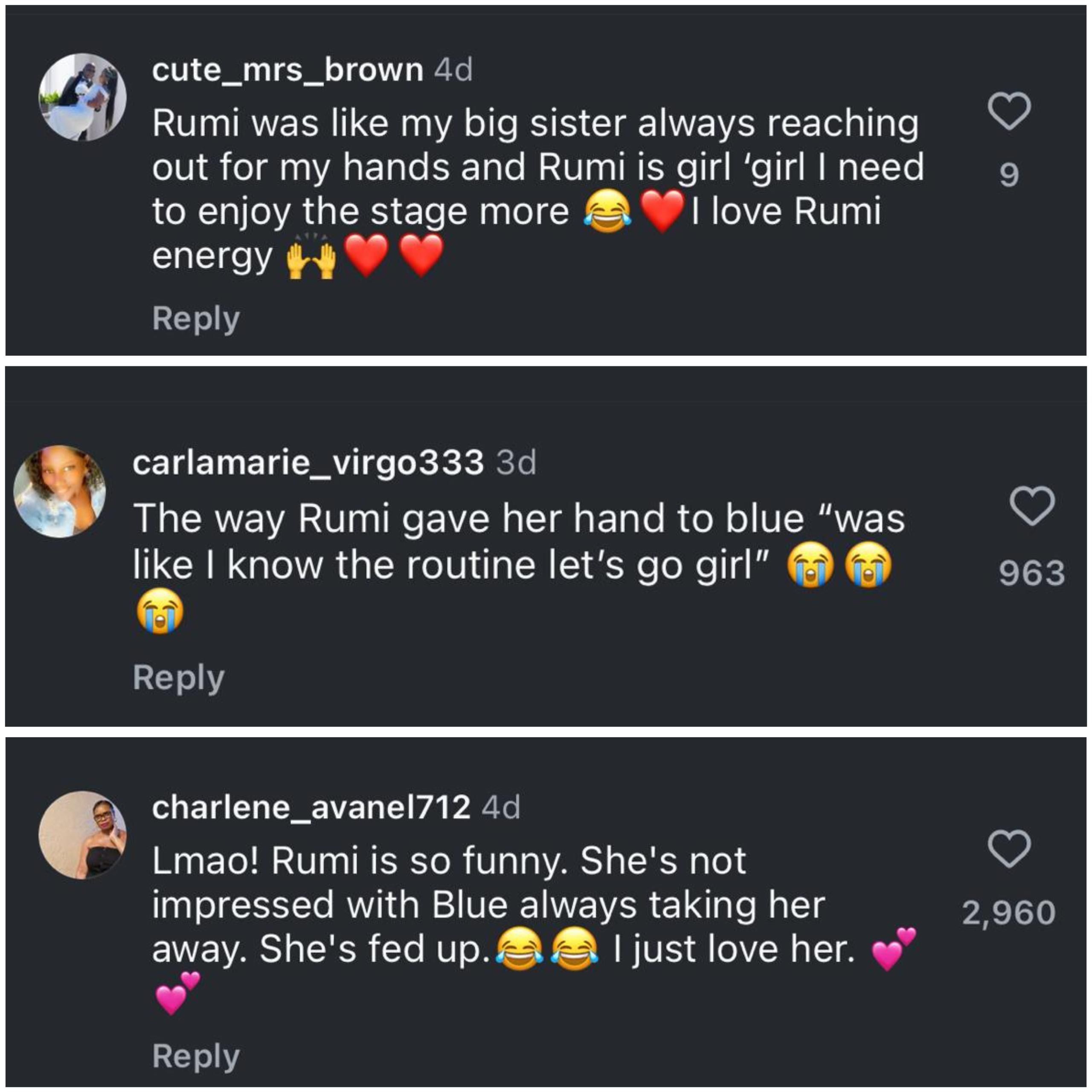 “Rumi was like my big sister, always reaching out for my hands, and Rumi is 'girl I need to enjoy the stage more. I love Rumi energy,” @cute_mrs_brown stated.