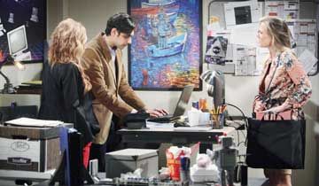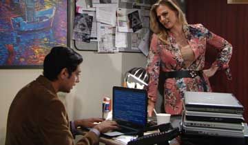 In Ravi's office at Jabot, Phyllis dramatically remarked that somewhere within the network lay the digital fingerprints of a corporate spy. She recalled when she'd been pretty good at code, and she inquired whether Ravi had found anything. He doubted that he'd find the smoking gun on Lauren's computer, but he insisted on checking all the machines. Phyllis was glad that he'd inspect her laptop, since she was paranoid that a supervirus would knock her out right before a deadline. Ravi commented that he'd rather worry about a virus than someone among them stealing.